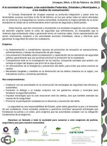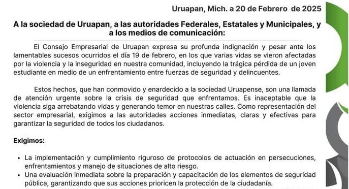 En una carta difundida en las redes sociales, el consejo que reúne a diferentes cámaras y asociaciones de comercio y empresariales, señala que los últimos hechos ha conmovido y enrarecido a la sociedad de Uruapan, la cual vive un crisis grave de inseguridad.