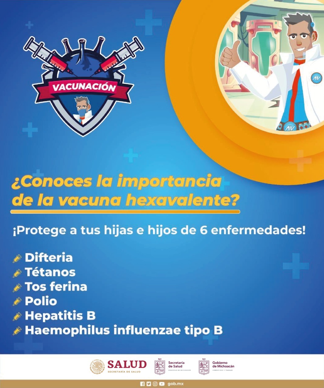 Morelia, Michoacán.- La Secretaría de Salud de Michoacán (SSM) exhorta a la población a proteger a los menores de un año contra la Poliomielitis, para ello, durante todo el mes de septiembre se estará aplicando la Hexavalente en todos los centros de salud, clínicas del ISSSTE y unidades de medicina familiar del IMSS.