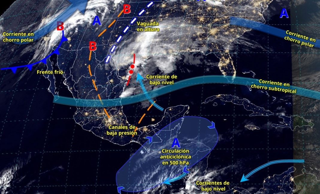 Hoy viernes, un canal de baja presión sobre el noreste de México, en interacción con la corriente en chorro subtropical, el ingreso de humedad del golfo de México, y con una línea seca que se establecerá sobre Coahuila, ocasionarán lluvias y chubascos en Nuevo León, San Luis Potosí, Veracruz y Puebla, con lluvias puntuales fuertes en Tamaulipas, donde existe la probabilidad de formación de torbellinos.