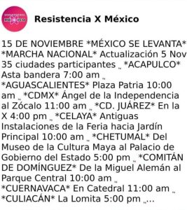 Lo ha publicado en su sitio oficial el movimiento de oposición al régimen denominado Resistencia X México, como también varios sitios de grupos de movimientos civiles. La invitación es al resto de las ciudades de todos los estados del país, que se espera se vayan sumando a esta movilización en estos días.