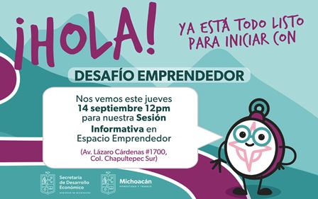 Con el propósito de fortalecer la economía de Michoacán por medio del impulso a las micro, pequeñas y medianas empresas (Mipymes), la Secretaría de Desarrollo Económico (Sedeco), a cargo de Claudio Méndez Fernández, convoca a participar en el Desafío Emprendedor, que iniciará el próximo jueves 14 de septiembre.