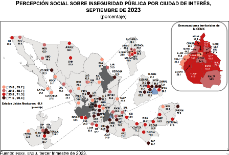 En septiembre de 2023, 67.4 % de las mujeres y 54.1 % de los hombres consideraron que vivir en su ciudad es inseguro. Las ciudades con mayor porcentaje de personas de 18 años y más que consideraron que vivir en su ciudad es inseguro fueron: Fresnillo, con 95.4 %; Ciudad Obregón, con 92.3 %; Zacatecas, con 92.1 %; Uruapan, con 91.5 %; Naucalpan de Juárez, con 87.3 %; y Toluca de Lerdo con 86.2 por ciento. En contraste, las ciudades donde la percepción de inseguridad resultó menor fueron: Benito Juárez, con 15.8 %; Piedras Negras, con 19.7 %; San Pedro Garza García, con 20.8 %; Cuajimalpa de Morelos, con 21.4 %; Puerto Vallarta, con 22.5 % y Los Mochis, con 24.1 por ciento.