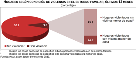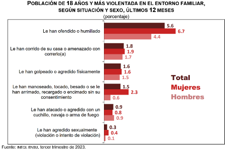 De octubre de 2022 a septiembre de 2023, se estima que, en zonas urbanas, 8.4 % de las personas de 18 años y más fue violentada en el entorno familiar. En mujeres, este porcentaje fue de 9.8 %; en hombres, de 6.8 por ciento.