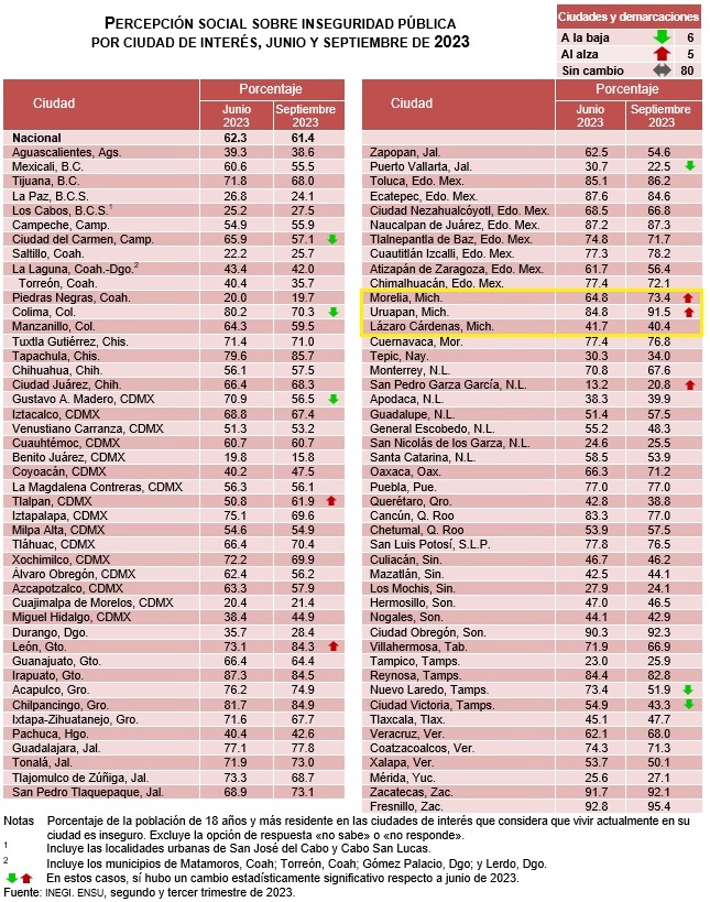 En el caso de Michoacán, en Morelia, el porcentaje de población que se siente insegura pasó de junio a septiembre del 64.8 por ciento al 73.4 por ciento, mientras que en Uruapan, dentro del mismo periodo pasó del 84.8 al 91.5 por ciento. En Lázaro Cárdenas se mostró un descenso, al pasar del 41.7 al 40.4 por ciento.