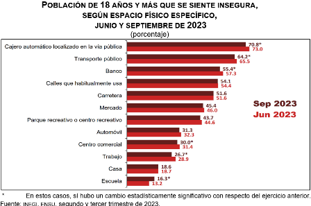 En cuanto a la percepción de inseguridad en espacios físicos específicos, en septiembre de 2023, 70.8 % de la población manifestó sentirse insegura en los cajeros automáticos localizados en la vía pública; 64.2 %, en el transporte público; 55.4 %, en el banco y 54.1 %, en las calles que habitualmente transita.