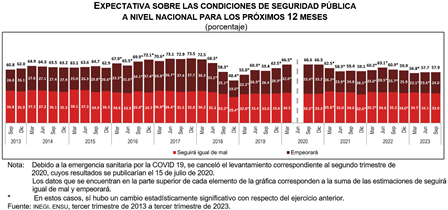 En septiembre de 2023, 33.9 % de la población de 18 años y más, residente en las ciudades de interés, consideró que, en los próximos 12 meses, la situación de la delincuencia e inseguridad en su ciudad seguirá igual de mal. Por otra parte, 24.0 % de la población refirió que la situación empeorará en los próximos 12 meses. En contraste, 18.3 % de la población de 18 años y más dijo que la situación de la delincuencia e inseguridad en su ciudad seguirá igual de bien y 22.6 % manifestó que mejorará.