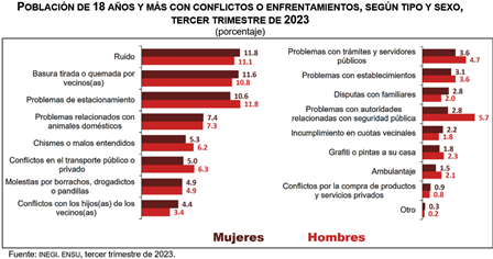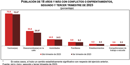 Durante el tercer trimestre de 2023, 33.9 % de la población de 18 años y más tuvo algún conflicto o enfrentamiento, de manera directa, con familiares, con las o los vecinos, con las o los compañeros de trabajo o escuela, con establecimientos, o con autoridades de gobierno. Lo anterior no representa un cambio estadísticamente significativo con respecto al porcentaje registrado en junio de 2023, que fue de 33.5 por ciento.