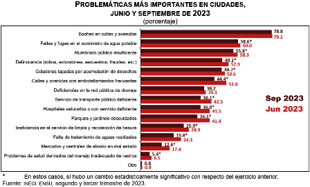 En septiembre de 2023, 78.8 % de la población de 18 años y más manifestó que los baches en calles y avenidas son uno de los problemas más importantes en su ciudad; 58.6 % dijo que lo son las fallas y fugas en el suministro de agua potable y 55.8 % consideró que el alumbrado público era insuficiente. Asimismo, 36.0 % respondió que los hospitales saturados o con servicio deficiente representan uno de los problemas más grandes en sus ciudades.