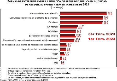Para mantenerse al tanto sobre la seguridad pública, el narcotráfico y la violencia, 60.6 % de la población de 18 años y más dijo informarse con los noticieros en televisión. Por su parte, 56.3 % respondió que mantiene comunicación personal en el entorno de la vivienda, 55.9 % dijo que por medio de Facebook y 23.5 % lo hizo mediante internet.