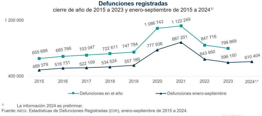 De enero a septiembre de 2024 se registraron 610 mil 404 defunciones. Se observó un incremento de 14 mil 254 muertes respecto a las registradas en forma definitiva en el mismo periodo de 2023. Del total de defunciones registradas, 589 mil 817 ocurrieron en 2024; las restantes, en años anteriores.