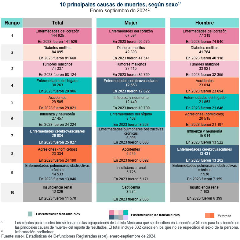 Las enfermedades del corazón, la diabetes mellitus y los tumores malignos fueron las primeras 3 causas de defunción a nivel nacional, tanto para mujeres como para hombres. A partir de la causa que ocupa la cuarta posición, se observan diferencias entre las 10 principales causas de defunción.