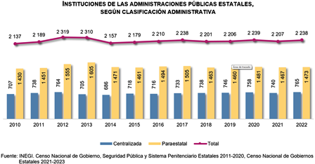 Al cierre de 2022, las administraciones públicas estatales contaron con un total de 2 mil 238 instituciones -se refiere a las organizaciones públicas que forman parte de la administración pública de la entidad federativa y, en consecuencia, se encuentran previstas en la respectiva ley orgánica; las Instituciones se crearon para el ejercicio de las atribuciones y despacho de los asuntos propios del Poder Ejecutivo Estatal-; de estas, 34.2 % correspondió a la administración pública centralizada y 65.8 % a la administración paraestatal. En contraste con 2021, la cantidad de instituciones de las administraciones públicas estatales aumentó 1.4 % en 2022.