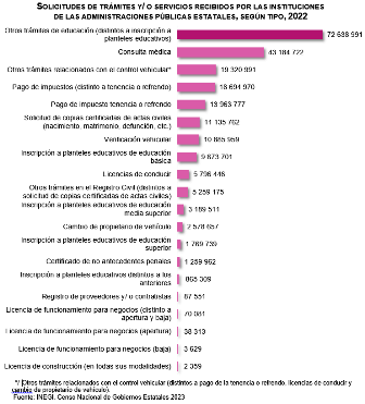 Durante 2022, las instituciones de las administraciones públicas estatales recibieron 220 millones 419 mil 628 solicitudes de trámites y servicios -de un listado de trámites y servicios seleccionados y establecidos en el instrumento de captación-. La principal categoría de estos fue Otros trámites de educación (distintos a inscripción a planteles educativos), que registró 72 millones 638 mil 991 solicitudes. En comparación con 2021 -se reportaron 163 millones 801 mil 005 solicitudes-, las solicitudes recibidas aumentaron 34.6 por ciento.