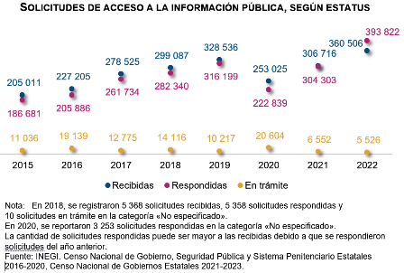 Durante 2022, las administraciones públicas estatales recibieron un total de 390 mil 022 solicitudes en materia de acceso a la información pública y de protección de datos personales. Al respecto, se respondieron 423 mil 898 solicitudes y, al cierre del año, 6 mil 855 quedaron en trámite.