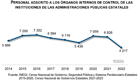 Al cierre de 2022, se registraron 4 mil 217 personas adscritas a los órganos internos de control u homólogos (OIC) de las administraciones públicas estatales. Comparado con 2021, esta cifra representa una disminución de 38.2 por ciento.