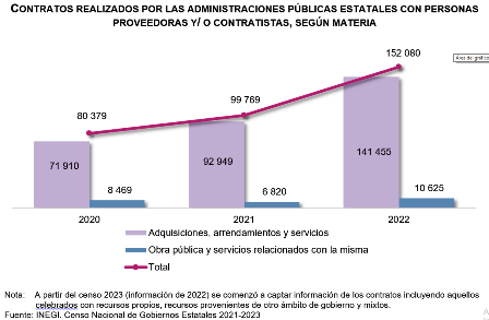 Al cierre de 2022, las administraciones públicas estatales realizaron 152 mil 080 contratos con personas proveedoras y/ o contratistas: 93.0 % (141 mil 455) en materia de adquisiciones, arrendamientos y servicios, y 7.0 % (10 mil 625) en obra pública y servicios relacionados con la misma. Con respecto a 2021, se registró un aumento de 52.4 % en el total de contratos realizados en 2022.
