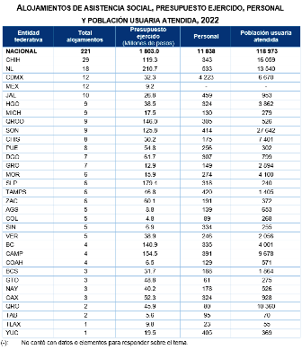 Al cierre de 2022, las administraciones públicas estatales operaron 221 alojamientos de asistencia social -se refiere al establecimiento que brinda albergue, refugio y otros servicios a personas que, por sus condiciones físicas, mentales, jurídicas o sociales, requieren de servicios especializados para su protección-; Chihuahua contó con la mayor cantidad, con 29. El total de personal que laboraba en los alojamientos fue de 11 mil 838 personas. Durante el año, se ejerció un presupuesto de mil 803 millones 036 mil 442 pesos -se considera la cantidad ejercida como parte del presupuesto asignado por la entidad federativa, así como las aportaciones del Gobierno Federal y, de ser el caso, de los municipios o demarcaciones territoriales y/ u otras instituciones o actores-, y se atendió a 118 mil 973 personas.