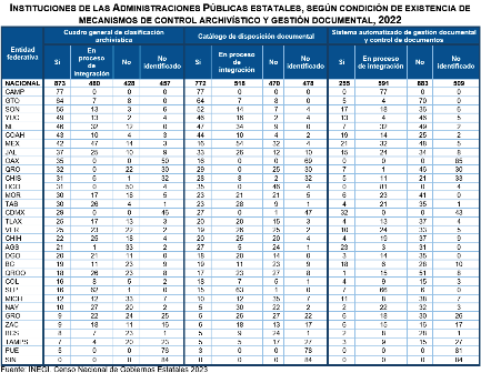 Al cierre de 2022, se registraron 873 instituciones de las administraciones públicas estatales que contaron con cuadro general de clasificación archivística -se refiere al instrumento técnico que refleja la estructura de un archivo con base en las atribuciones y funciones de cada sujeto obligado-; 772, con catálogo de disposición documental -se refiere al registro general y sistemático que establece los valores documentales, la vigencia documental, los plazos de conservación y la disposición documental-, y 255, con sistema automatizado de gestión documental y control de documentos -se refiere al tratamiento integral de la documentación a lo largo de su ciclo vital, a través de la ejecución de procesos de producción, organización, acceso, consulta, valoración documental y conservación-.