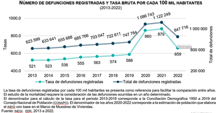 La tasa de defunciones registradas en 2022 por cada 100 mil habitantes fue de 659, menor en 220 unidades respecto a la del año anterior.
