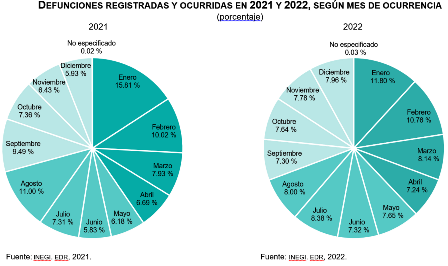 Del total de defunciones registradas y ocurridas en 2022, los meses con el mayor número de decesos fueron: «enero», con 11.80 % (97 mil 433) y «febrero», con 10.76 % (88 mil 786).