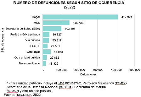 De las muertes registradas, 48.6 % (412 mil 321) tuvo lugar en el hogar y 39.8 % (337 mil 084), en hospitales públicos y privados.