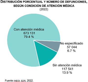 De las personas fallecidas, 79.4 % (673 mil 131) contó «con atención médica», 13.9 % (117 mil 541) «no tuvo atención médica» y 6.7 % (57 mil 044) de los casos fue «no especificado».