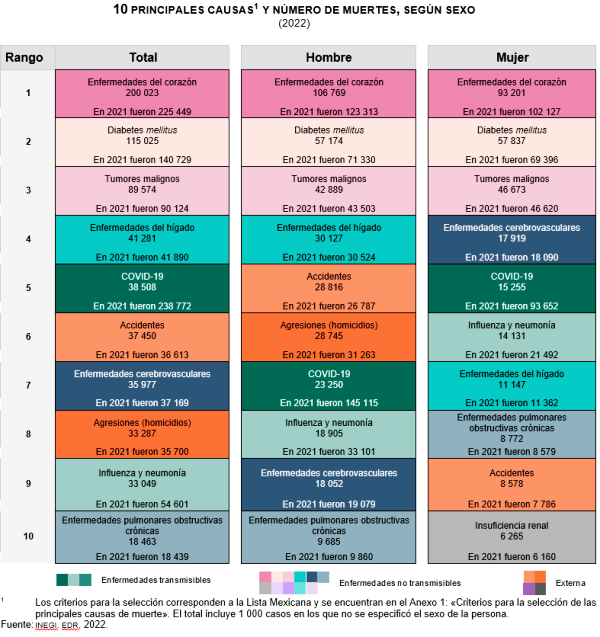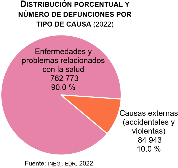 Del total de muertes registradas en 2022, 90.0 % (762 mil 773) se debió a «enfermedades y problemas relacionados con la salud».