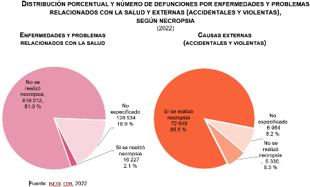 Del total de defunciones registradas por enfermedades y problemas relacionados con la salud (762 mil 773), a 81.0 % de las personas «no se le realizó la necropsia»; a 2.1 % «sí» y en 16.9 % de los casos «no se especificó».