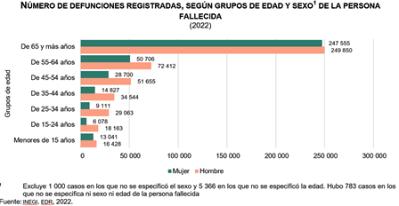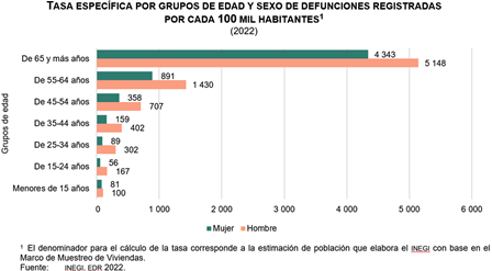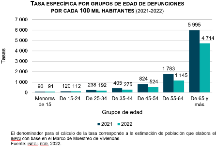 Por grupos de edad, el «de 65 años y más» fue el que concentró el mayor número de muertes, con 497 mil 488 (58.7 %) de los 847 mil 716 decesos registrados. La tasa específica de mortalidad para este grupo es de 4 mil 714 defunciones por cada 100 mil habitantes.
