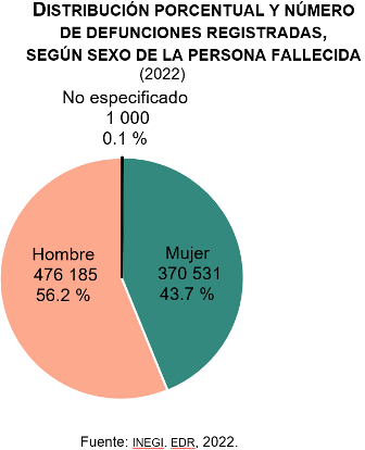 Según el sexo de las personas fallecidas, 370 mil 531 fueron «mujeres» (43.7 %) y 476 mil 185, «hombres» (56.2 %). En mil casos no se especificó el sexo de la persona fallecida.