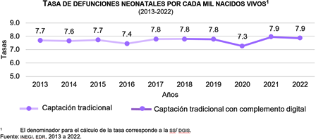 Cabe mencionar que las defunciones neonatales incluyen a las personas fallecidas entre 0 y 7 días de edad que, en conjunto con las defunciones fetales que ocurren a partir de la semana de gestación 22, integran las defunciones perinatales.