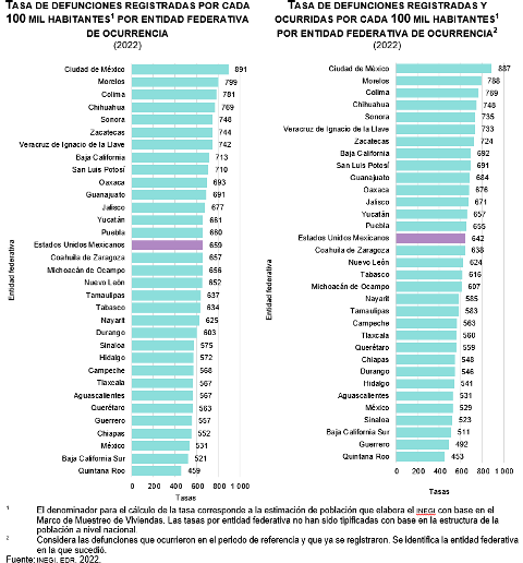 A nivel nacional, a las defunciones registradas y ocurridas en 2022 les correspondió una tasa de 642 por cada 100 mil habitantes. La entidad con la tasa más alta fue «Ciudad de México», con 887 y «Quintana Roo» la menor, con 453.