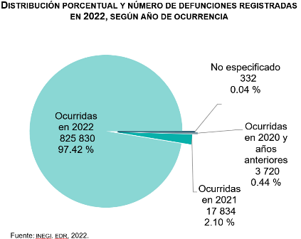 Del total de defunciones registradas en 2022, 97.42 % (825 mil 830) ocurrió en el mismo año, con una disminución de 0.5 % respecto a 2021; 2.10 % (17 mil 834) ocurrió en 2021 y 0.44 % (3 mil 720), en 2020 y en años anteriores. En 332 casos no se especificó el año de defunción.