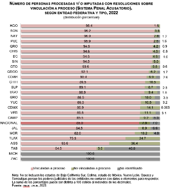 En cuanto al Sistema Integral de Justicia Penal para Adolescentes, Campeche, Colima, Hidalgo, Jalisco, Michoacán de Ocampo, San Luis Potosí, Sinaloa y Tabasco fueron las entidades donde la totalidad de personas imputadas fueron vinculadas a proceso.