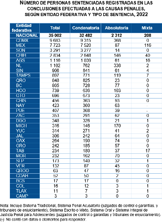 En 2022, los poderes judiciales estatales registraron 35 mil 002 personas sentenciadas: 7.1 % (2 mil 498) correspondió a mujeres y 83.1 % (29 mil 081), a hombres -no se incluyen las categorías «no identificado» y «no especificado» que corresponden a 9.7 % (3 mil 405) y 0.1 % (18)-. Las personas adultas representaron 97.3 % y las adolescentes, 2.7 por ciento. En contraste con 2021, el total de personas sentenciadas disminuyó 0.1 %. De acuerdo con el tipo de sentencia, 92.8 % fue condenatoria; 6.6 %, absolutoria y 0.6 %, mixta.