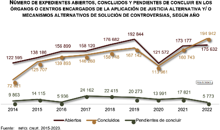 Durante 2022, los órganos o centros encargados de la aplicación de justicia alternativa y/o mecanismos alternativos de solución de controversias de los poderes judiciales estatales, reportaron un total de 175 mil 632 expedientes abiertos, 194 mil 942 expedientes concluidos y 5 mil 773 expedientes pendientes de concluir en todas las materias -se consideran los expedientes concluidos y pendientes de concluir independientemente de que se hayan abierto y/o iniciado durante el año o en ejercicios anteriores-. En contraste con 2021, los expedientes abiertos y concluidos incrementaron 1.4 y 21.3 %, respectivamente, mientras que los pendientes de concluir disminuyeron 67.6 %.