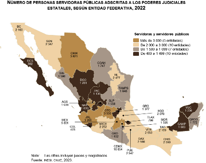 Por poder judicial estatal destacaron Ciudad de México, con 14.9 %, y el estado de México, con 7.9 % del total de personal adscrito.