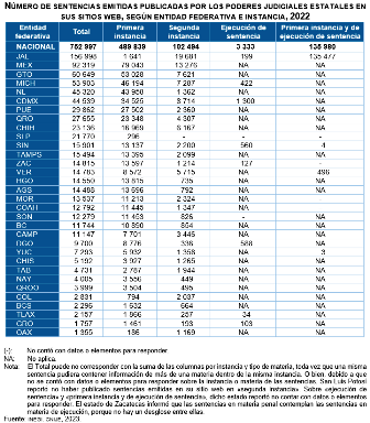 En 2022, los poderes judiciales estatales publicaron en sus sitios web 752 mil 997 sentencias emitidas por los órganos jurisdiccionales. En contraste con 2021 -se publicaron 461 mil 730 sentencias emitidas-, la cantidad total de sentencias publicadas en las páginas de internet aumentó 63.1 por ciento. A la primera instancia correspondieron 489 mil 839 sentencias; a la segunda instancia, 102 mil 494; a ejecución de sentencia, 3 mil 333 y, a primera instancia y de ejecución de sentencia, 135 mil 980 -para el resto de las sentencias publicadas no se especificó la instancia-.
