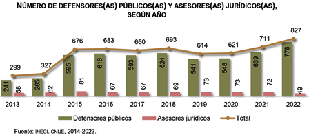 Al cierre de 2022, las defensorías públicas o de oficio a cargo de los poderes judiciales estatales contaron con mil 055 servidoras y servidores públicos. Del total, 46.7 % correspondió a hombres y 53.3 %, a mujeres. Específicamente, 78.4 % (827) del personal se desempeñó como defensora o defensor público y asesora o asesor jurídico. Con respecto a 2021, esta cantidad aumentó 16.3 %.