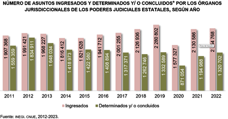 En 2022, los poderes judiciales de Ciudad de México y estado de México concentraron 24.4 % de los asuntos ingresados. Mientras que los poderes judiciales del estado de México y Guanajuato concentraron 24.2 % de los asuntos determinados y/ o concluidos en todas las materias.