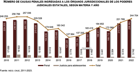 Durante 2022, a los órganos jurisdiccionales de los poderes judiciales estatales ingresaron 244 mil 704 causas penales: 238 mil 962 en materia penal para personas adultas y 5 mil 742 en la materia de justicia para adolescentes. En contraste con 2021, el total de causas penales ingresadas aumentó 10.3 por ciento. En materia penal, el aumento fue de 10.9 %, mientras que, en materia de justicia para adolescentes, disminuyó 9.1 por ciento.