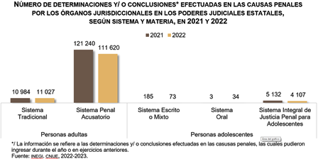 En 2022, los órganos jurisdiccionales de los poderes judiciales estatales efectuaron 126 mil 861 determinaciones y/ o conclusiones en las causas penales, las cuales pudieron ingresar durante el año o en años anteriores: 96.7 % correspondió a personas adultas y 3.3 %, a adolescentes. Comparado con 2021, el total de determinaciones y/ o conclusiones disminuyó 7.8 por ciento. En las materias penal y justicia para adolescentes, la disminución fue de 7.2 y 20.8 %, respectivamente.