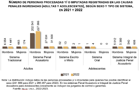 Durante 2022, en las causas penales ingresadas, se registraron 292 mil 929 personas procesadas y/ o imputadas: las mujeres representaron 11.0 %; los hombres, 79.9 % y en 9.1 % de los casos no se especificó el sexo. Del total de personas procesadas y/ o imputadas, 97.9 % correspondió a adultas y 2.1 %, a adolescentes. Comparado con 2021, en 2022 el porcentaje de mujeres aumentó 14.3 % y el de hombres, 9.6 %.