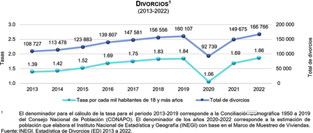 Los divorcios en el país se incrementaron en los últimos años. La tasa -se calcula dividiendo el número de divorcios entre la población de 18 años o más a mitad del año; el resultado se expresa por cada mil personas de 18 años o más- nacional de divorcios por cada mil habitantes de 18 años o más pasó de 1.39 en 2013 a 1.86 en 2022. El año 2020, que coincidió con el inicio de la pandemia por la COVID-19, presentó una disminución respecto a 2019.