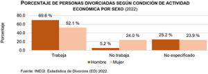 Respecto a la condición de actividad económica, en 2022, de los 166 mil 641 hombres divorciados, 69.6 % (115 mil 949) declaró que trabajaba. Del total de mujeres divorciadas (166 mil 891), 52.1 % (86 mil 949) declaró lo mismo al momento del divorcio.