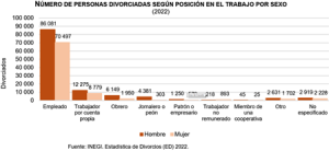 En 2022, de las personas divorciadas que declararon que trabajaban. El mayor porcentaje manifestó desarrollarse como empleadas. El porcentaje de mujeres fue 81.0 % y el de los hombres, 74.3 por ciento. Siguieron las y los trabajadores por cuenta propia, con 10.1 % en mujeres y 10.5 % en hombres. En tercer lugar, se encontraron las obreras y obreros, con 2.3 y 5.3 %, respectivamente.