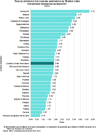 En 2022, las entidades con las mayores tasas de divorcios por cada mil habitantes de 18 años o más fueron: Campeche (4.75), Sinaloa (3.71) y Nuevo León (3.58). Las tasas más bajas las presentaron: Veracruz de Ignacio de la Llave (0.76), Oaxaca (0.92) y Puebla (1.17).