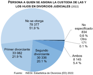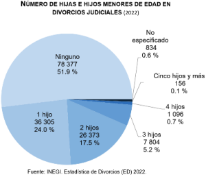 Durante 2022, de los 150 mil 945 divorcios judiciales registrados en México, 24 % de los matrimonios extinguidos tenía una o un hijo menor de edad; 17.5 % tenía dos hijas y/ o hijos; 6.0 %, más de dos; 51.9 % no tenía hijas ni hijos al momento de efectuarse el divorcio y en 0.6 % de los casos no se especificó.