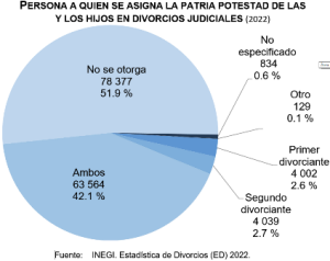De los divorcios judiciales que se llevaron a cabo en 2022, en 42.1 % de los casos se otorgó la patria potestad a las dos personas divorciantes; en 5.3 %, a una de ellas y en 51.9 %, a ninguna. Lo anterior, porque en el matrimonio disuelto no había menores o ya no dependían de sus padres. En 0.6 % de los casos no se especificó.