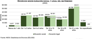 En 2022, 33.5 % de los matrimonios se disolvió legalmente después de 20 años de matrimonio, 46.1 % duró entre seis y 20 años, 18.7 % tuvo una duración legal entre uno y cinco años y, en 1.5 % de los casos, la duración fue menor a un año.